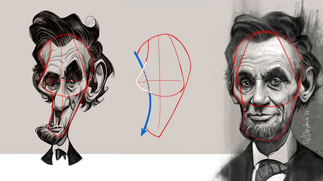 The base of a good caricature is the head shape, which dictates weight distribution and how the features are placed. But how does one go about building it? You’ll find out how in this lesson!